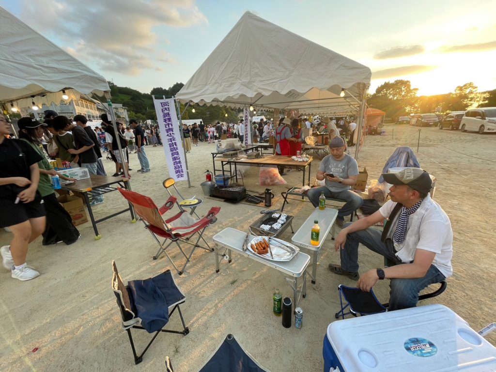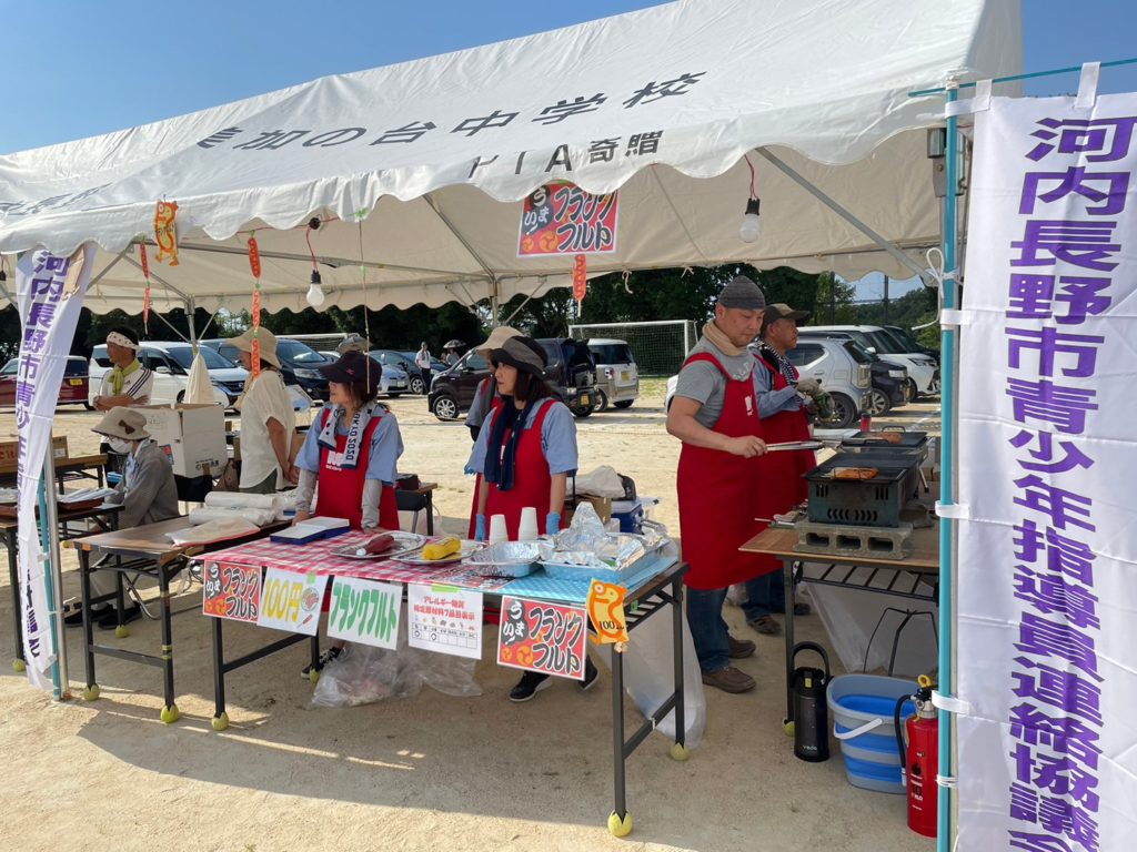 美加の台小学校にて、4年ぶりに「美加の台夏祭り」が開催され、美加の台校区の青少年指導員として、主催者の健全育成会をサポートする形で、朝の8時30分からテントや舞台の設営などに参加し、模擬店としては「フランクフルト」を出店いたしました。
