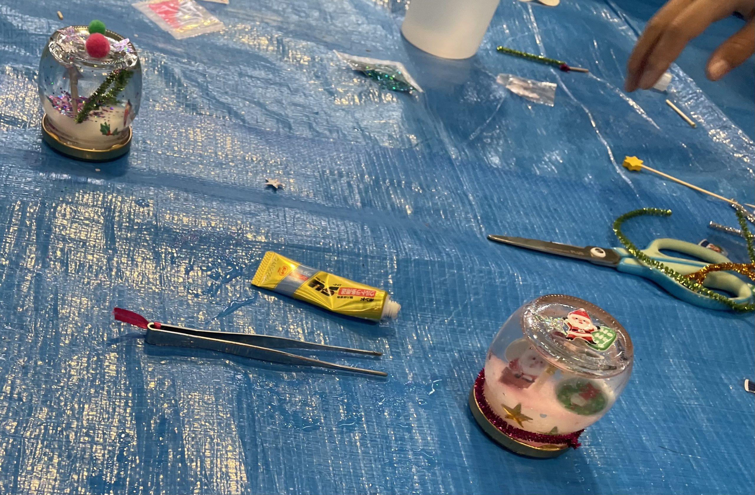 スノードーム作りでは、参加者が思い思いにデザインしたクリスマスらしいミニオブジェができました。