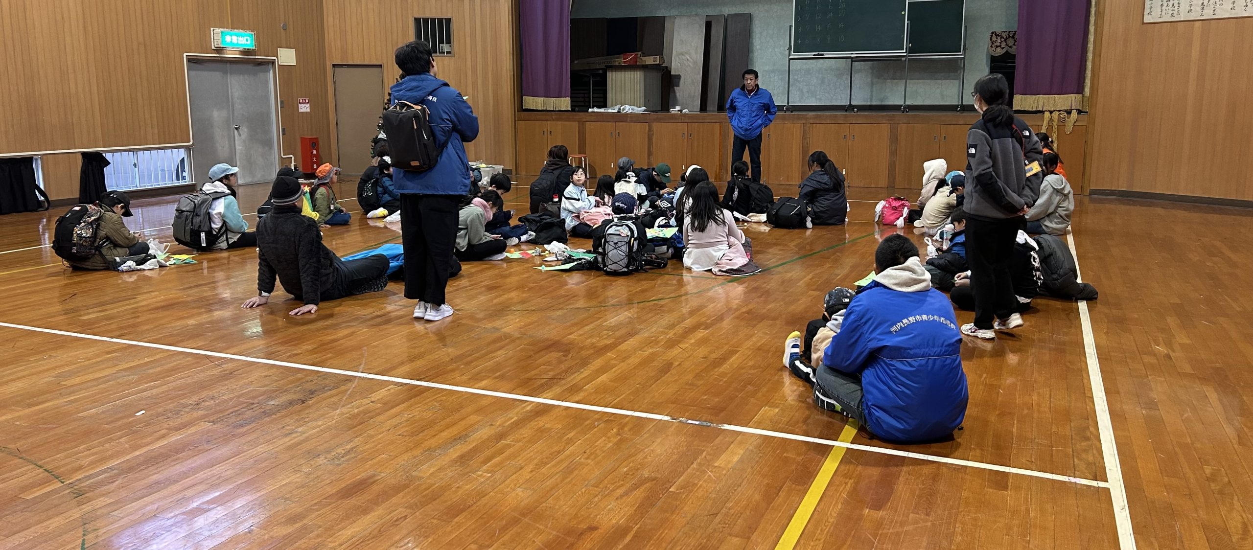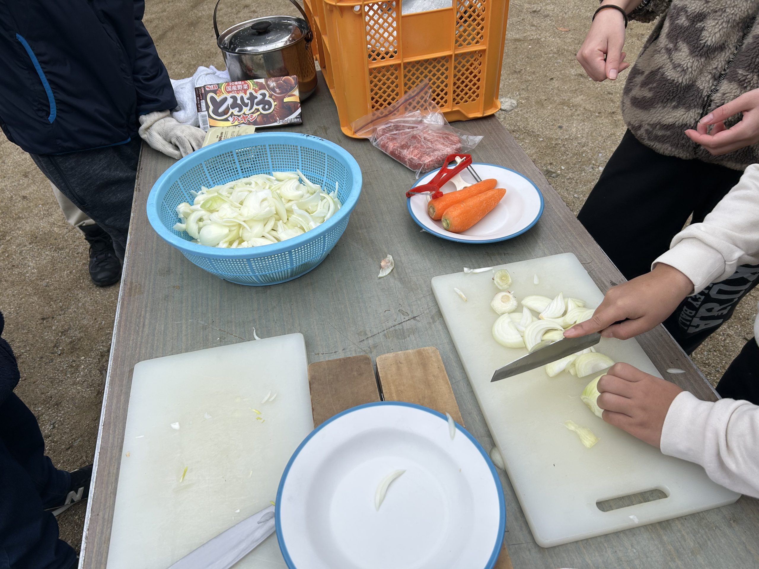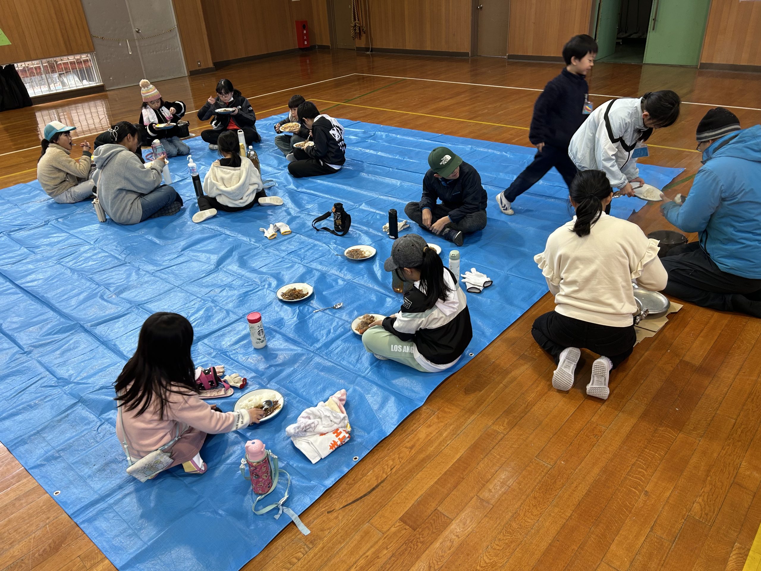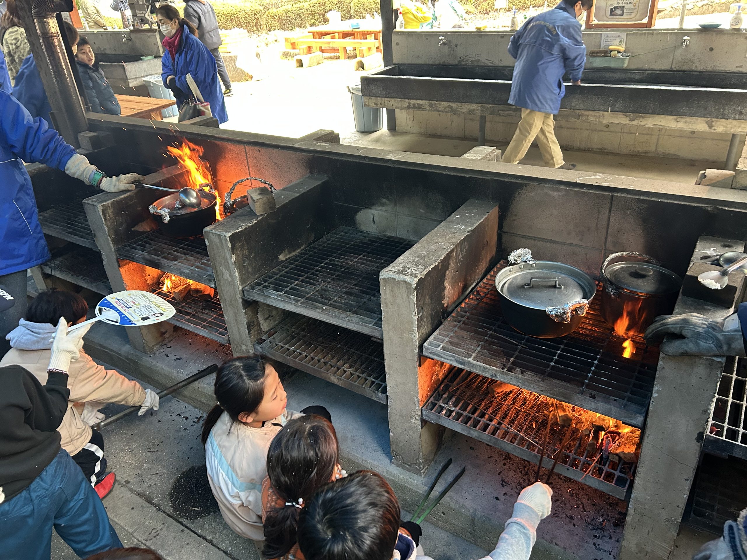 各班のメンバーが野菜切りや炊飯などを協力して行い、美味しく昼食をいただきました。寒さとともに雨の心配もあり、食事は体育館でいただきました。