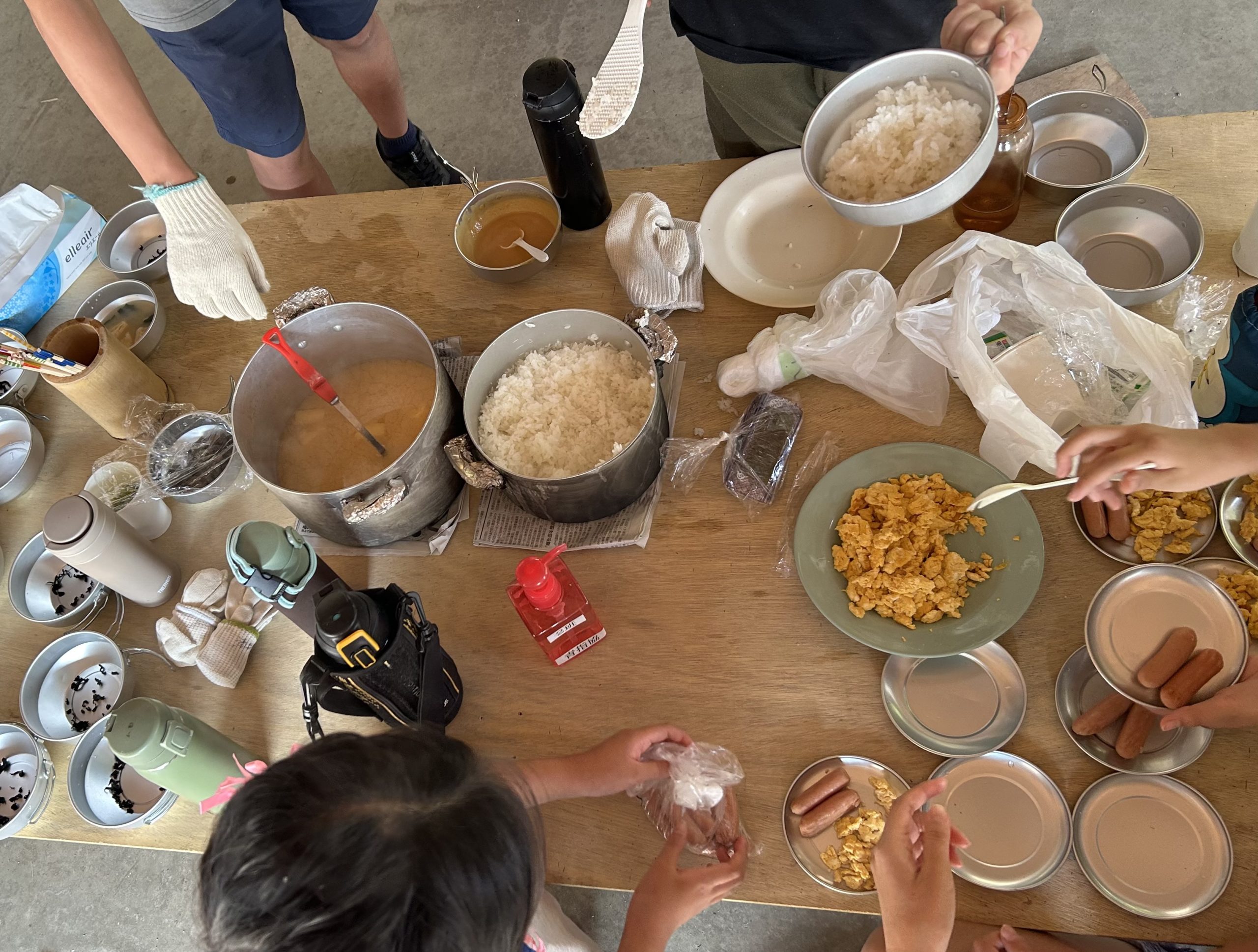 朝のつどいのあとご飯、みそ汁などの朝食(自炊はこれが最後)をとります
