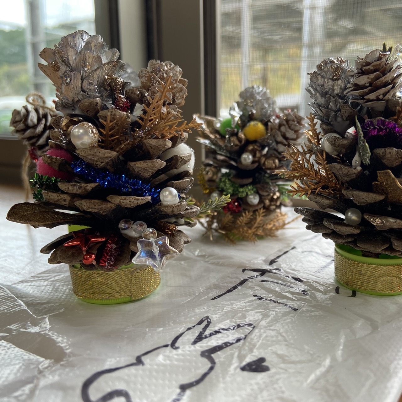準備してくださっていた自然の松ぼっくりの中から、それぞれ気に入った形を選び、モールやクリスマスらしい装飾をきれいに飾り付けました。
