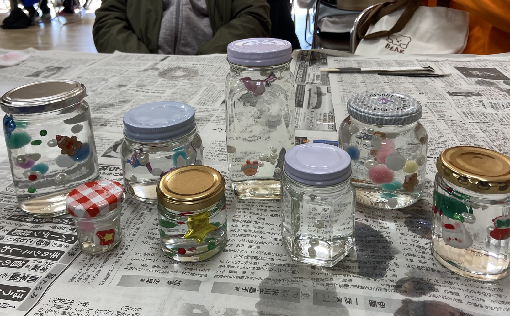 参加者が各自持参した小さめの瓶に、100均で購入した消臭ビーズを水に浸したものとクリスマスらしい飾りを入れるだけのシンプルな工程ですが、水を含んだビーズは瓶の中では透明になって見えなくなるため、瓶の中でクリスマスの飾りだけが浮いて見えるという不思議な出来上がりでした。
